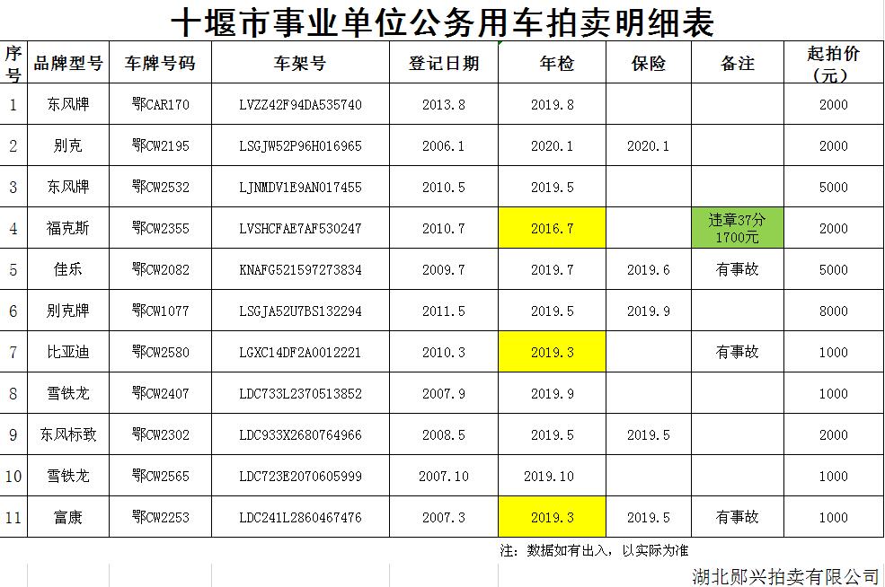 受委托,湖北鄖興拍賣有限公司向社會公開拍賣張灣區(qū)、鄖陽區(qū)公務(wù)用車60余輛( 有大眾、本田、別克、日產(chǎn)、現(xiàn)代、雪鐵龍等)。